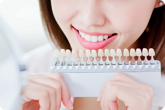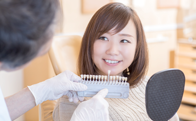 歯の表面をわずかに削って、セラミックの薄い板を貼りつけます。矯正治療などに比べて、短期間で歯の色味や形のお悩みを改善できるのが特徴で、前歯のすき間や変色、歯の表面の白や茶色の斑点が気になるといった場合におすすめの治療法です。