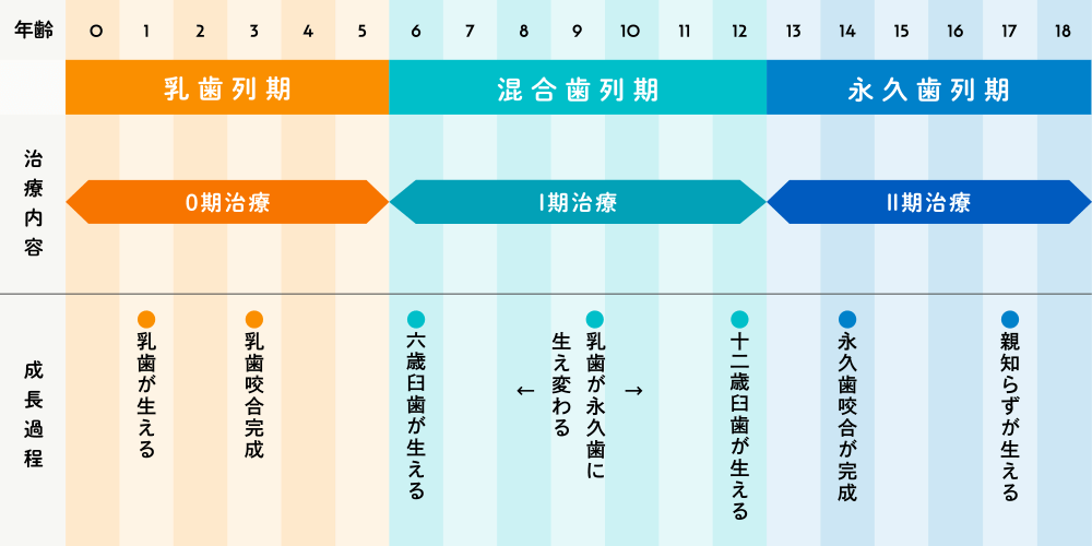 小児の矯正治療は、年齢や歯の生え変わりによってⅠ期とⅡ期とに区別できます。お子さんの成長する力を利用してきれいな歯並びの土台を整えるⅠ期治療は、永久歯の歯並びを動かすⅡ期治療と比べて負担が少なく、Ⅱ期治療の負担軽減も期待できます。