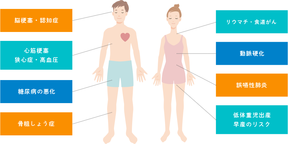 現在、国内の成人の8割が歯周病にかかっていると言われています。私たちが歯を失う主な原因にもなっています。気づかないうちに進行する病気ですが、定期的な検診で早期に発見し、適した治療やケアを行うことで、ダメージを食い止めることは可能です。少しでも気になる症状があるかたはもちろん、ご不安やご心配のあるかたもお気軽にご相談ください。